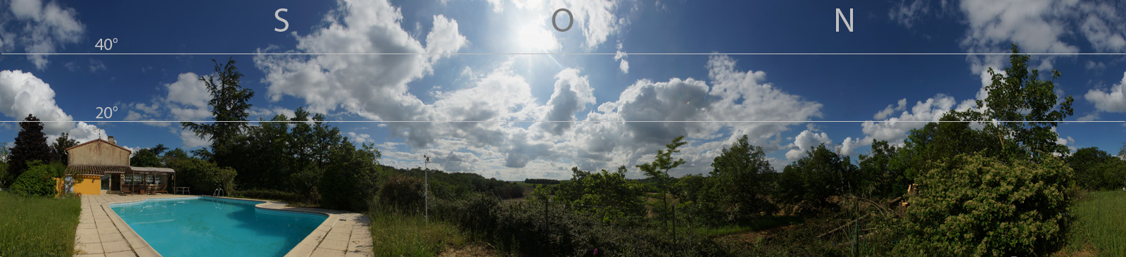 Les horizons N et NE sont assez bien dégagés malgré la présence de quelques arbres. E et SE sont dégagés. Au Sud un imposant cèdre (jusqu’à 40°) et des arbres jusqu'à une hauteur de 20-25°. L’horizon Ouest est bien dégagé mais la pollution lumineuse au NO due à l'agglomération toulousaine à 50km est importante.